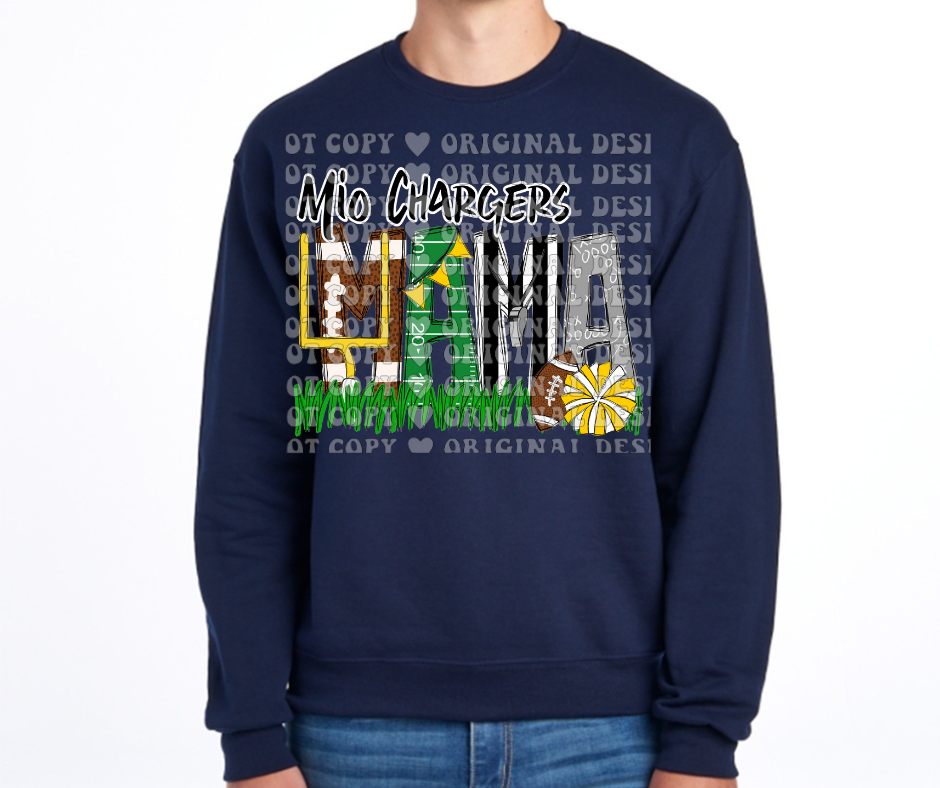 This fun design comes with the Mio Chargers Mama design on the chest with a fun optional sleeve detail. If you'd like to add kid's names & graphics to the sleeve please use the customization box and include which designs (pictured... football jersey, helmet, cheer uniform, pom, megaphone, cleats, foam finger). If you'd like them in a certain order (top to bottom or left sleeve vs right sleeve) please note that detail too or I will just go in order they are listed (my personal top has 7 children between the two sleeves so we've got room if you have a handful of kids you'd like).