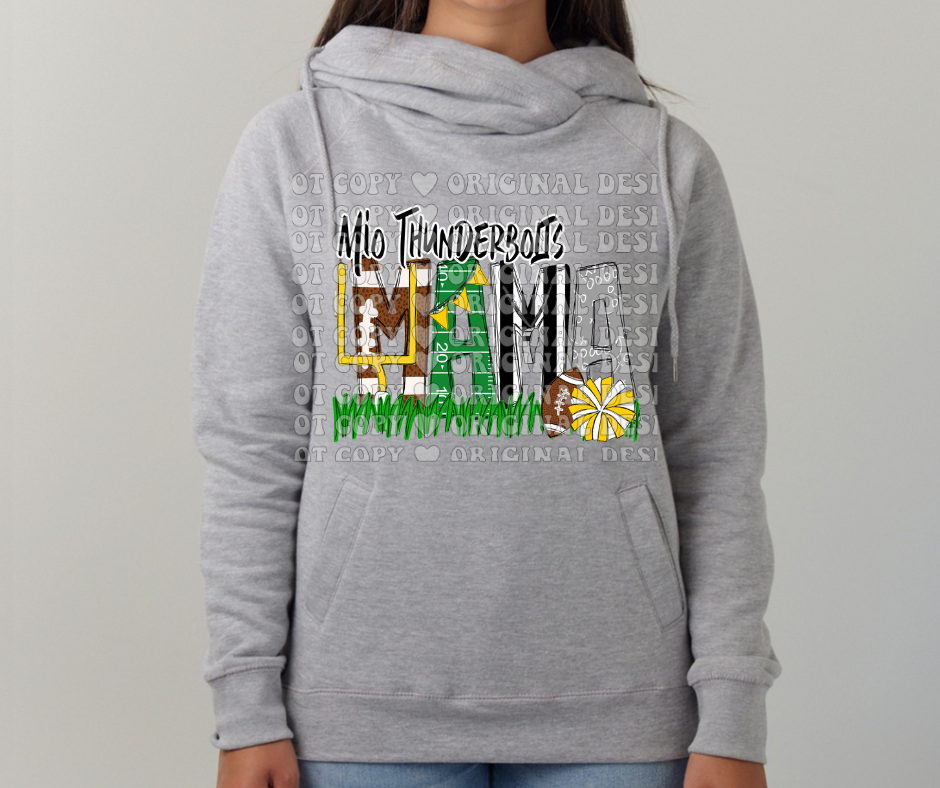 This fun design comes with the Mio Thunderbolts Mama design on the chest with a fun optional sleeve detail. If you'd like to add kid's names & graphics to the sleeve please use the customization box and include which designs (pictured... football jersey, helmet, cheer uniform, pom, megaphone, cleats, foam finger). If you'd like them in a certain order (top to bottom or left sleeve vs right sleeve) please note that detail too or I will just go in order they are listed (my personal top has 7 children between the two sleeves so we've got room if you have a handful of kids you'd like).